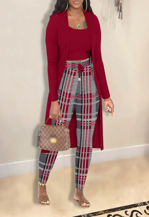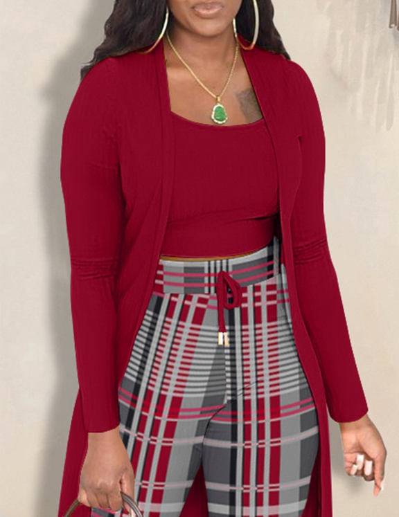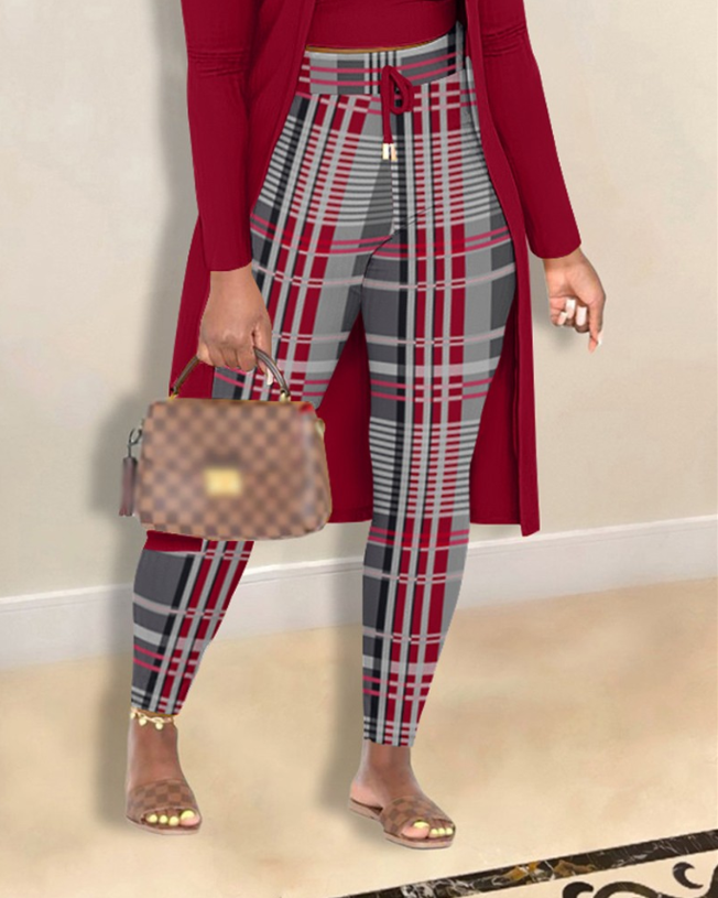3 pc Cami Top & Plaid Print Pants Set with Longline Coat